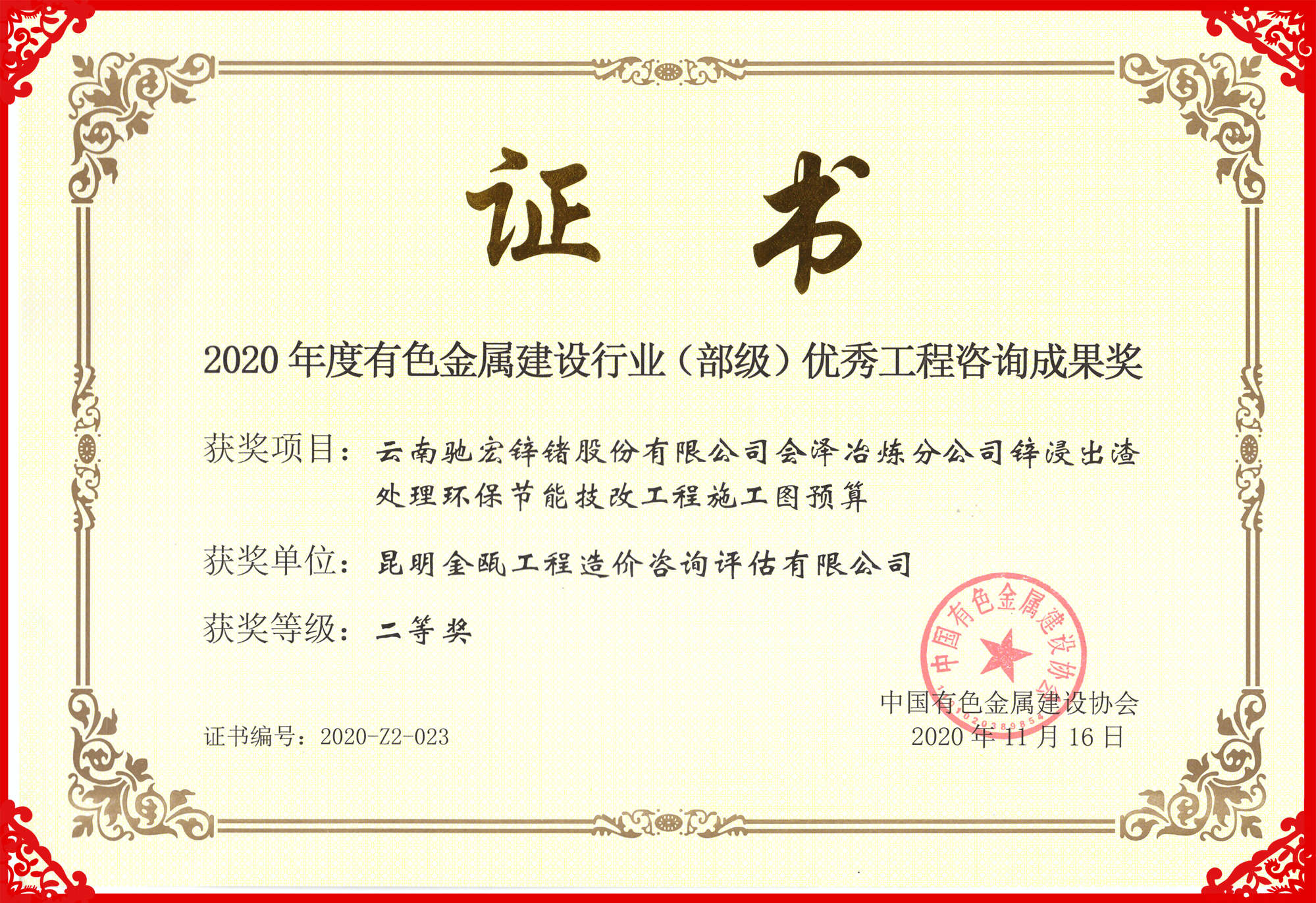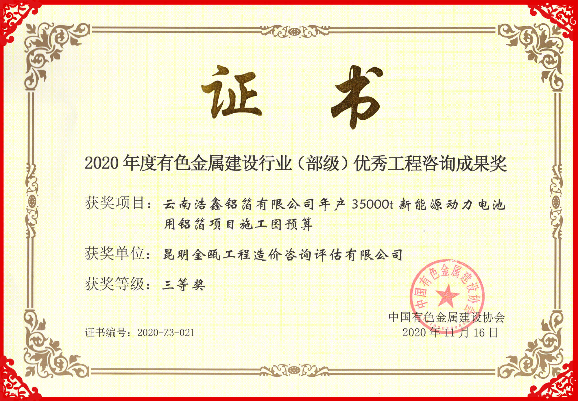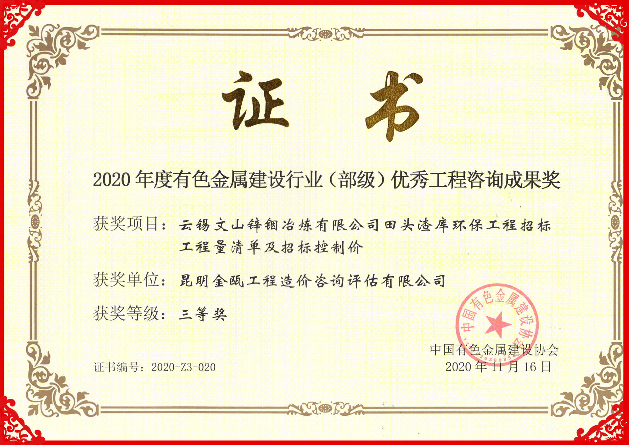 熱烈祝賀昆明金甌工程造價咨詢評估有限公司在2020年度中國有色金屬建設(shè)行業(yè)咨詢成果評獎活動中