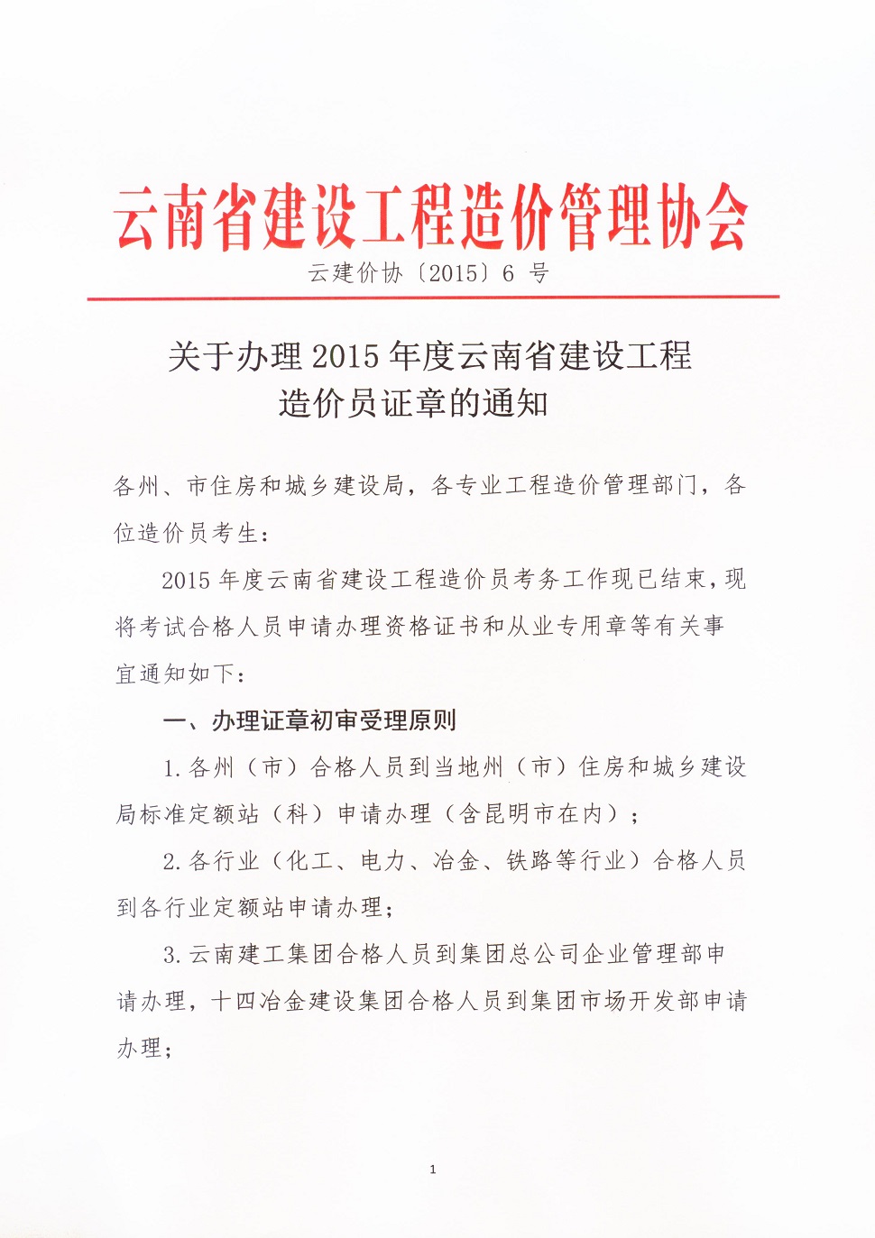 關(guān)于辦理2015年度云南省建設(shè)工程造價(jià)員證章的通知